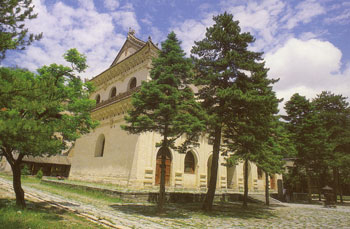 无量殿,是明代用青砖拱券而成的一座穹窿式建筑,四周没有檐廊,殿内没有梁柱,又称无梁殿,是中国古代建筑艺术的杰作。相传唐代清凉国师澄观在此殿内著述《新华严经疏》几达四年之久。内供毗卢佛大铜像,取佛法无量之意,故称“无量殿”。